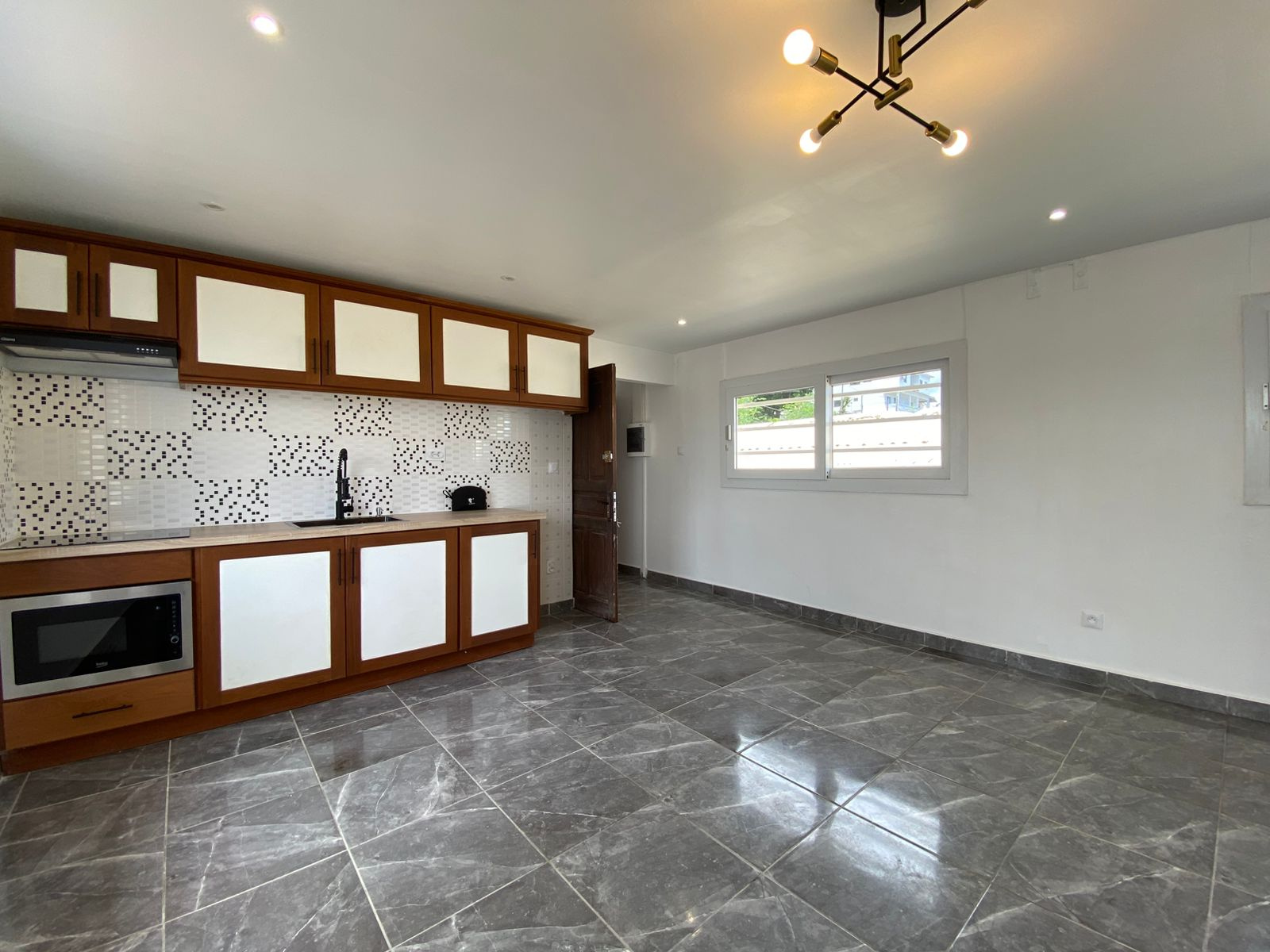 Un grand séjour avec cuisine ouverte semi-équipée, une chambre climatisée et d'une salle d'eau avec WC.