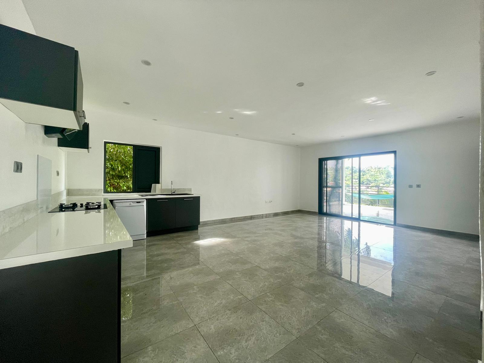 Un grand séjour spacieux et lumineux avec une cuisine ouverte aménagée et équipée.