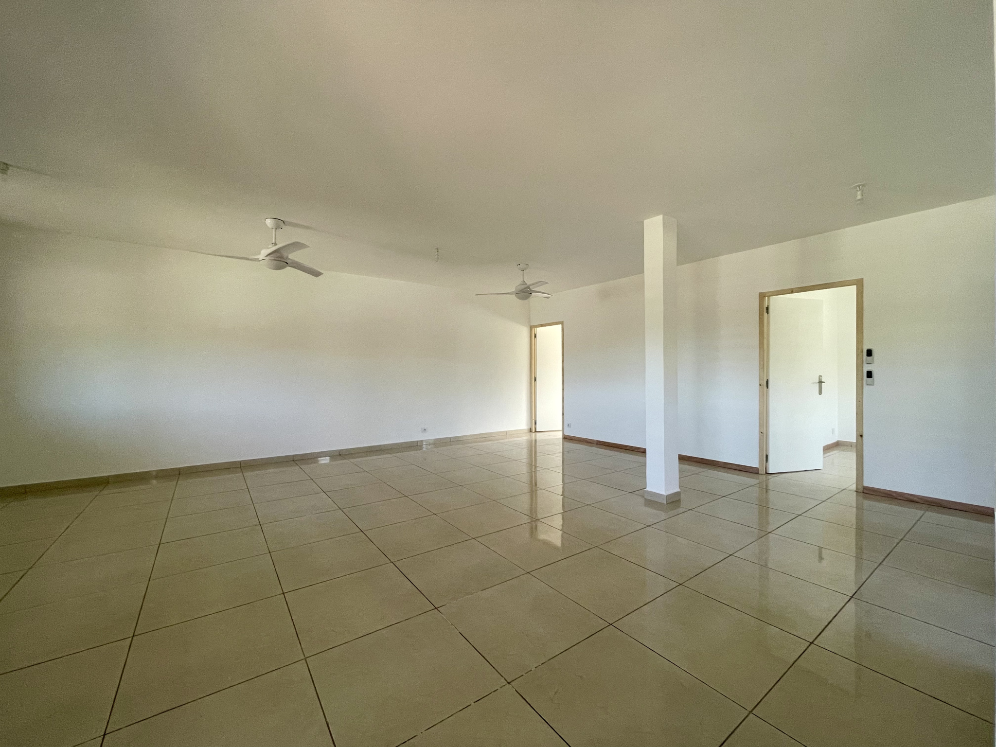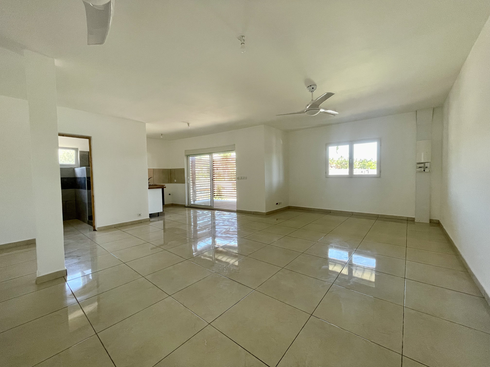 Un grand séjour lumineux équipé d'un brasseur d'air avec cuisine ouverte aménagée et semi-équipé.