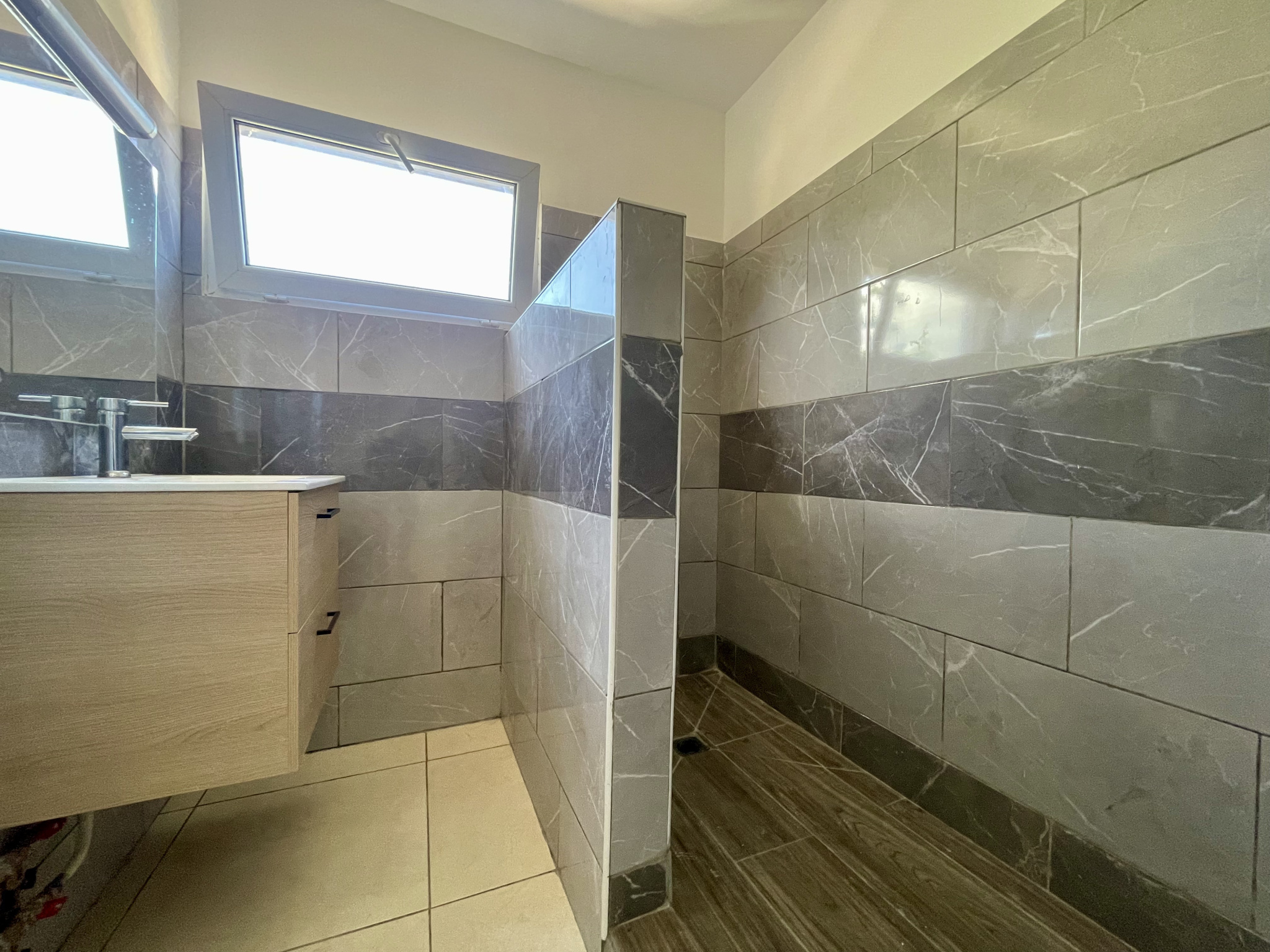 Le coin nuit propose deux chambres climatisées et une salle d'eau avec WC séparé.